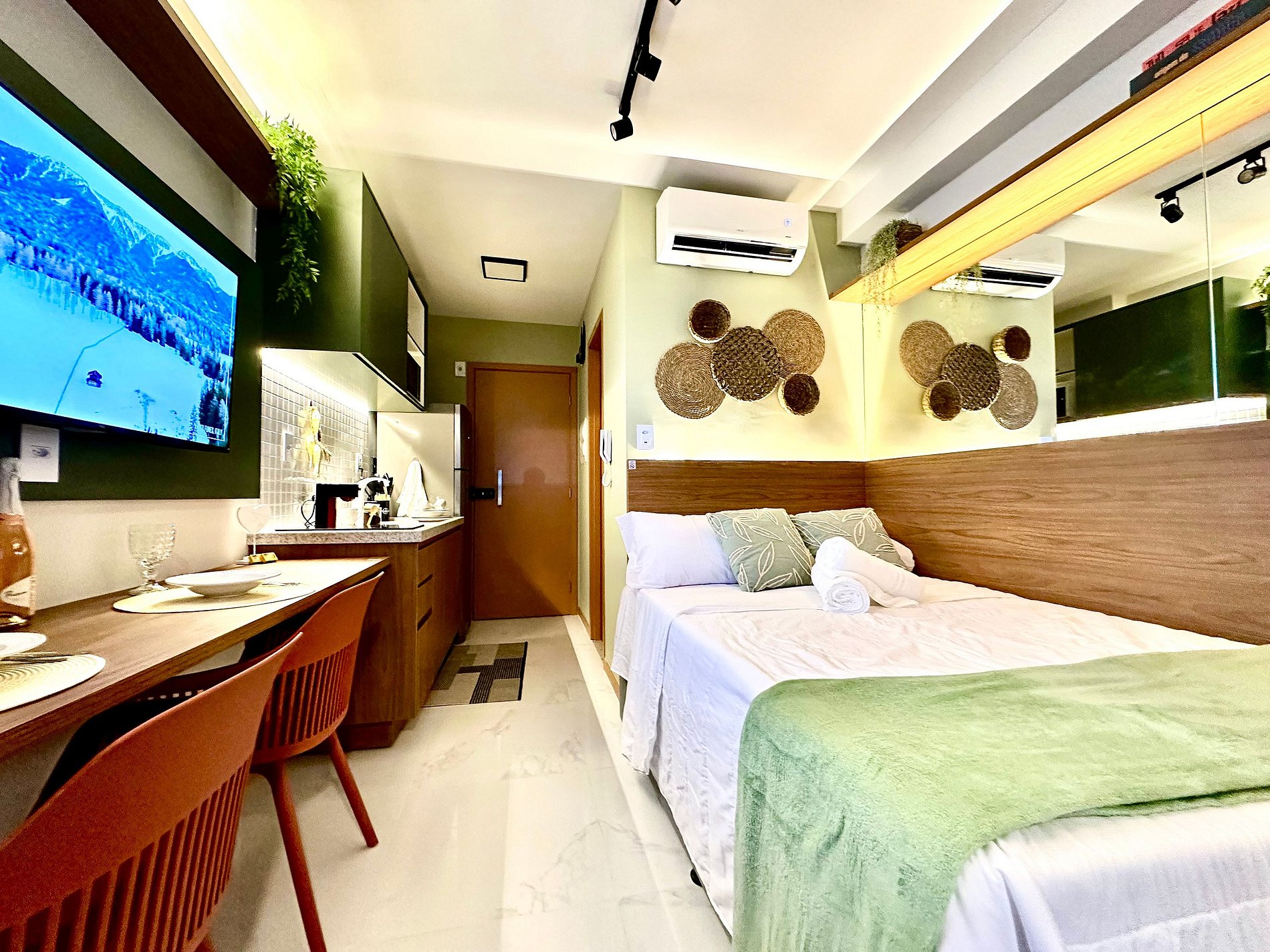 Com bancada para refeições e também para trabalho, guarda-roupa para organizar seus pertences, smart tv e internet.