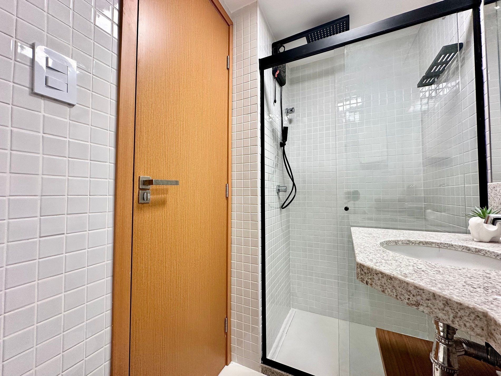 Todos os apartamentos possuem fechadura eletrônica para maior segurança. A senha de acesso personalizada será enviada no dia do check-in, proporcionando uma entrada prática e privada no seu apartamento.