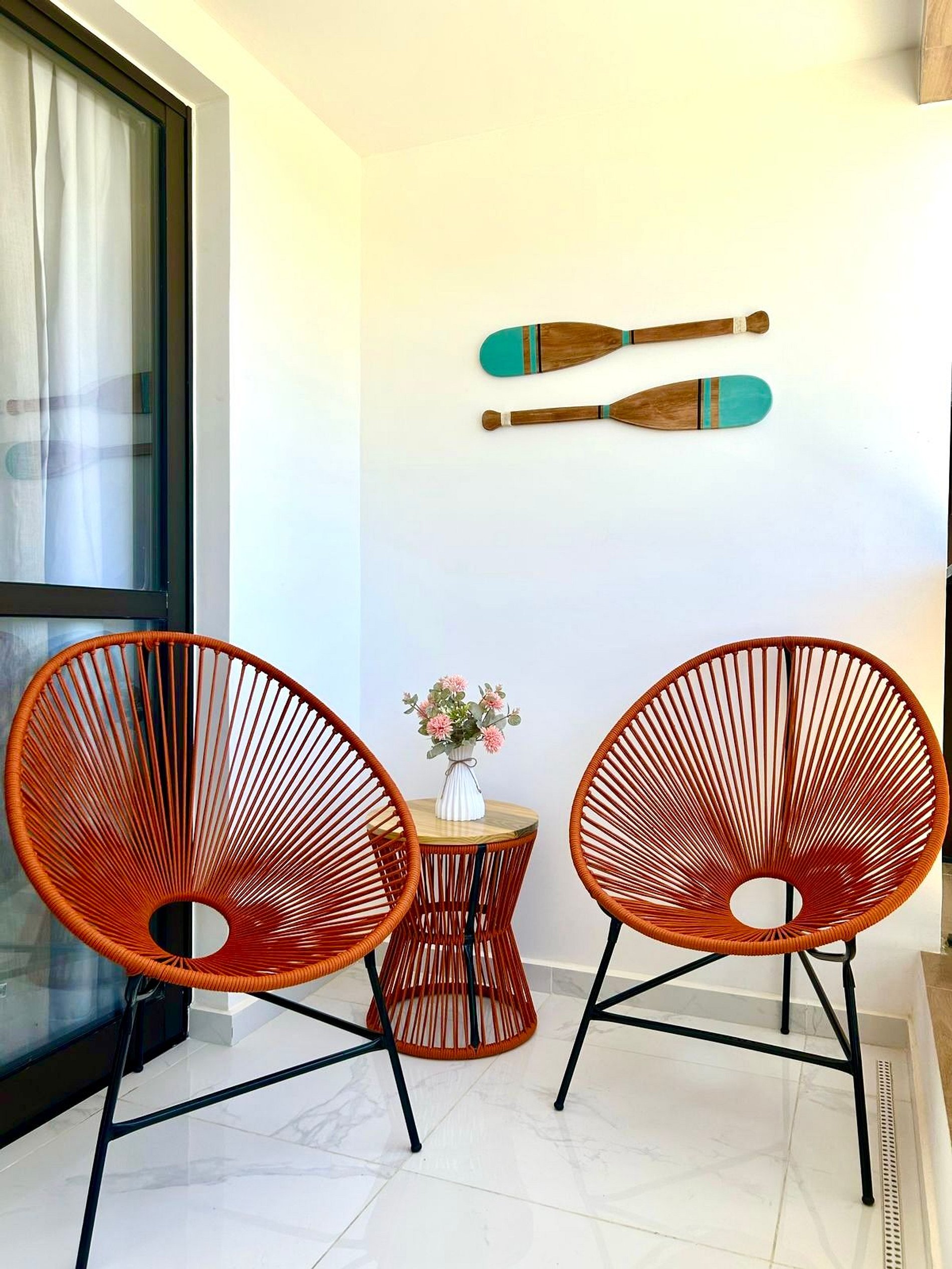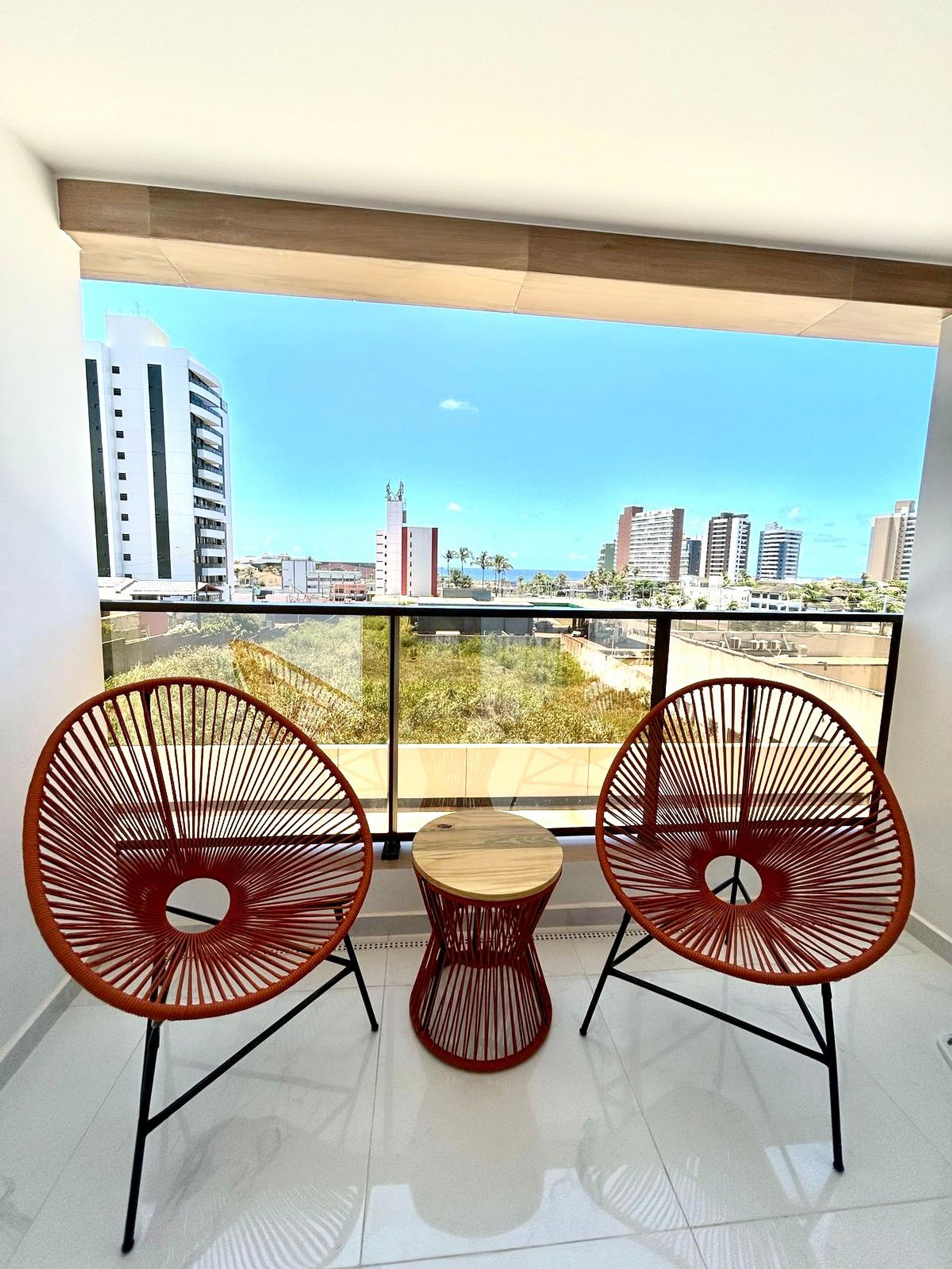 Varanda com mesa, cadeiras e com vista mar.