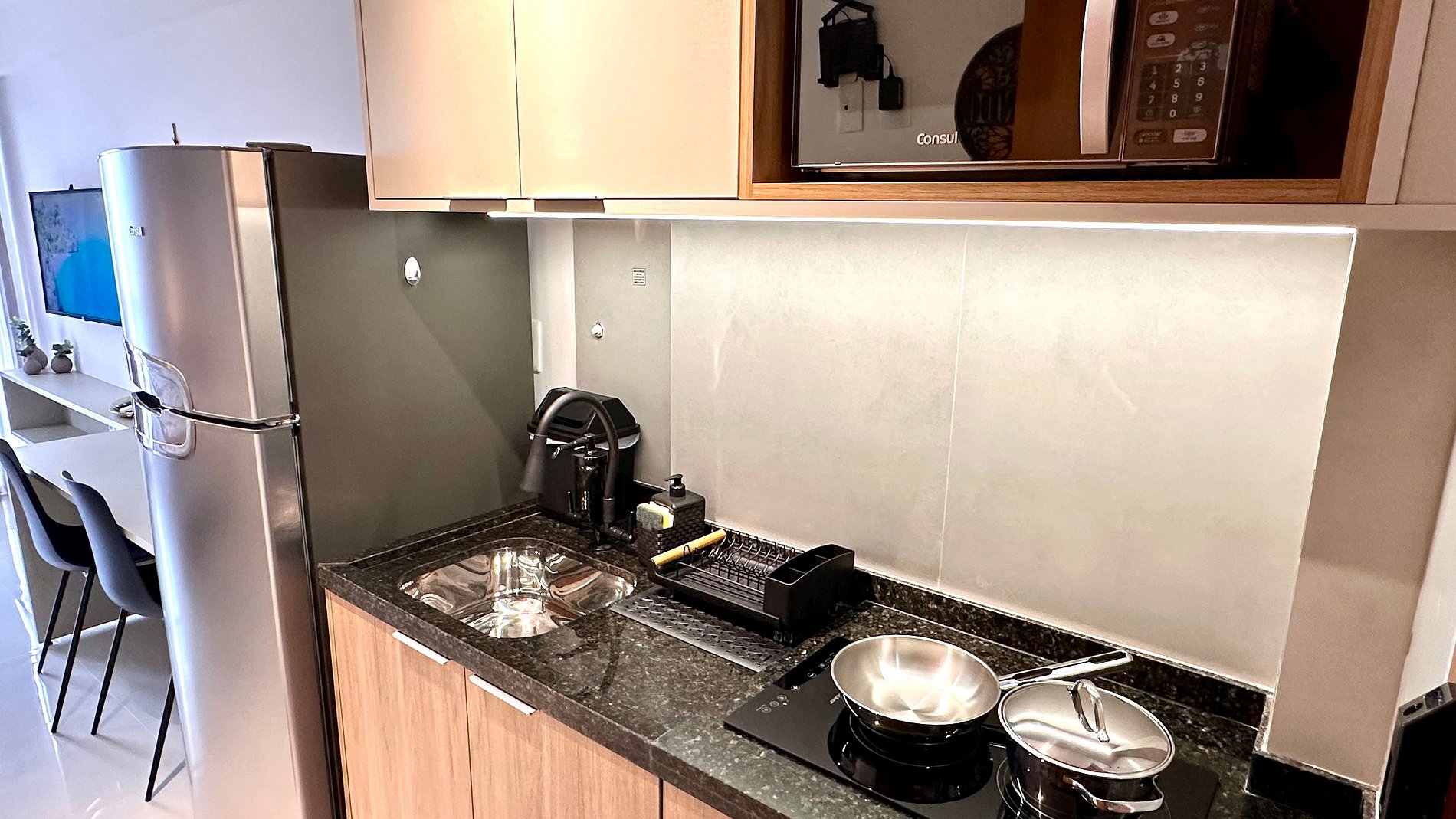 Imóvel conta com cama de casal confortável, ar-condicionado split, cozinha equipada com utensílios, cooktop, geladeira duplex, micro-ondas, Wi-Fi rápido, TV e espaço para home office. Ideal para casais, viajantes solo ou estadias a trabalho.